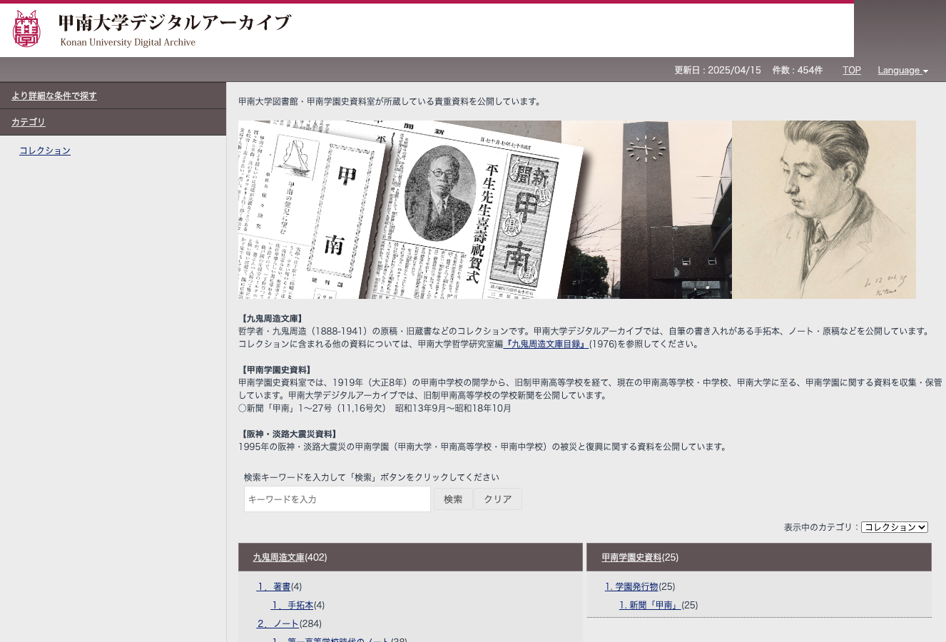 最初に公開したコンテンツは、甲南大学図書館で所蔵している九鬼周造文庫です。九鬼周造氏は京都学派に連なる著名な哲学者で、旧制甲南高等学校の校長だった天野貞祐氏と深い交遊がありました。この天野氏の斡旋により、その蔵書を旧制甲南高等学校が受け入れたのが九鬼周造文庫の始まりで、後に遺品や手稿も寄贈されました。こうした貴重な一次資料が公開された結果、今や海外の研究機関からも頻繁にアクセスされています。その後、甲南学園史資料を追加公開し、2025年1月には震災後30年に合わせ阪神・淡路大震災資料が「学園が震えた日」として一般公開されました。特に後者は在校生に当時の惨状を伝え継ぐ重要なメディアともなっています。